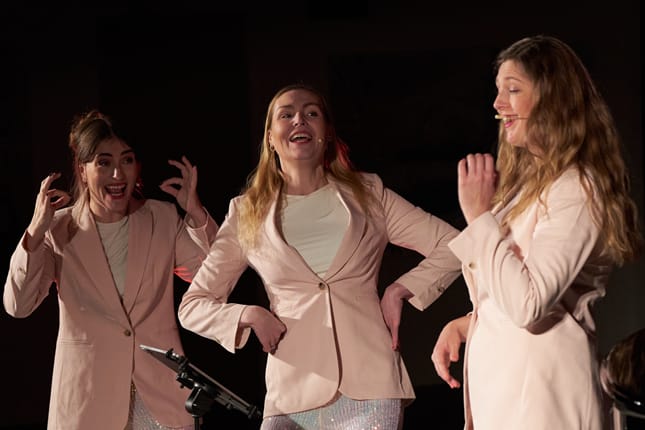Vokalgruppens navn efterlader desuden plads til en selvironisk og satirisk tilgang til dét at være kvinde i dag, hvilket kan høres i de tekster og vokalarrangementer, som Barbieshop selv laver over kendte sange.